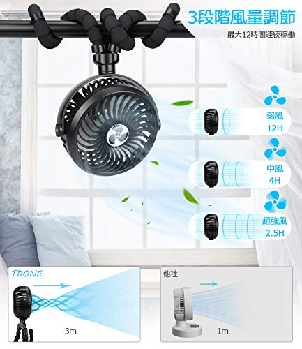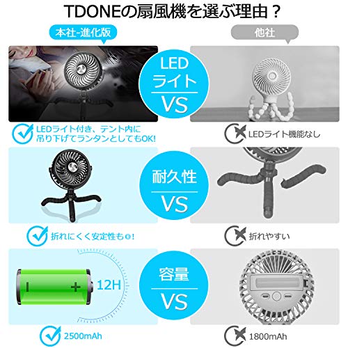 TDONE 携帯扇風機 【2020最新モデル】 扇風機 小型 手持ち扇風機 usb 充電式 静音 卓上 巻き付け 吊り上げ フレキシブル三脚 2500mAh 11時間連続駆動 720°角度調節 LEDライト 車用 アウトドア 熱中症対策 暑さ対策 18ヶ月保証 (ブラック)