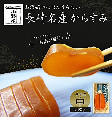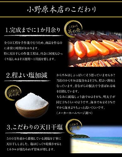 小野原本店のからすみは無添加・無着色、伝統の製法でひとつひとつ手作業で造り上げています。からすみは高級な食べ物ですが、サイズが大中小選べ、小は安い価格帯でお手頃です。