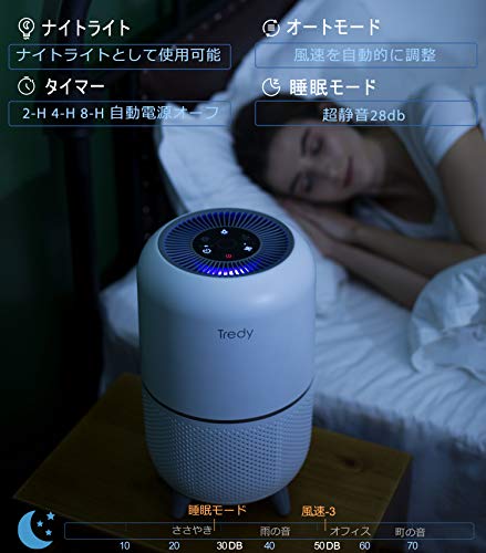 睡眠モードを利用すれば、静音での運転が可能です。また、Tredy 空気清浄機には4段階浄化システムが採用されているので、安心して利用できます。