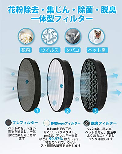 大きな異物・ペットの毛を補修するプレフィルター、0.1μmまでのほこり・花粉・ハウスダストなどを99.97%除去するHEPAフィルター、タバコ臭やペット臭などをしっかりと浄化してくれる脱臭フィルターが搭載されていて、360°全方向から汚れた空気を吸収し、綺麗な空気を送り出すことができる高性能な空気清浄機です。