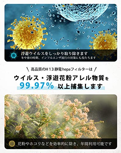 優秀なHEPAフィルターを搭載しており、ホコリやカビ、ウイルスやペットの毛、花粉やPM2.5などさまざまな物質を取り除きます。アレルギー対策にもなるのがポイントです。