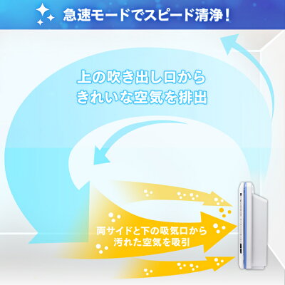 上の吹き出し口から綺麗な空気を排出し、両サイドかと下にある吸気口から汚れた空気を取り入れます。フィルターを取り換えれば、常に綺麗な空間を保つことが可能です。
