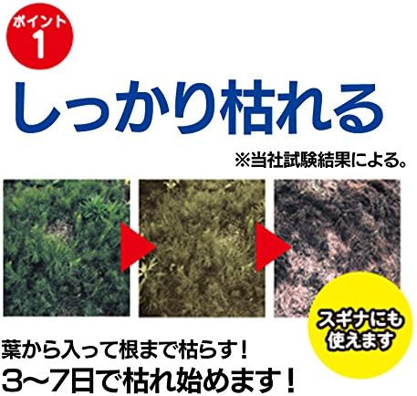 今回初めて除草剤を購入しました(ドクダミを枯らすため)。正直、どれがいいのか分からなかったので、ベストセラーのマークが付いているこの商品を選びました。 撒いた翌日には色が変わり始めて、1週間くらいでちゃんと枯れました。良い商品だと思います。