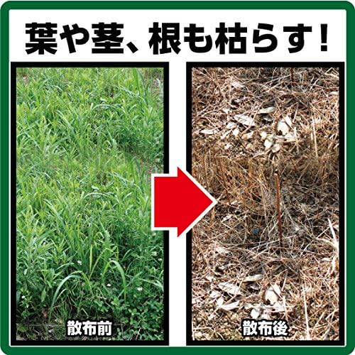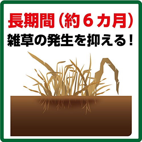 一年生雑草をはじめ、ヨモギやスギナ、ササやススキ、セイタカアワダチソウなどの枯れにくい雑草にも強力に作用する粒タイプの除草剤です。枯らした後の新たに発芽した芽にも作用して枯らすことができますので、何度も散布しないで使えます。1平方メートルあたりの散布量が適切なので、ムラが出来ないように撒くことができ、効果を満遍なく行き渡らせることができます。効果は約6ヶ月間と長く続く除草剤です。