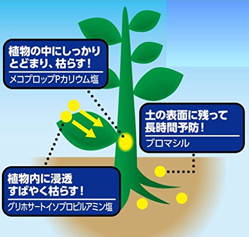 部分的にかかった場合にも、草や葉にしっかりと浸透して吸収させるグリホサートイソプロピルアミン塩をはじめ、雨でも流されにくくのっヶ月間雑草の生育を抑制できるブロマシル、しつこいスギナにも強力な効果を発揮してくれるメコプロップPカリウム塩など、三つの有効成分を配合しています。広範囲にも簡単に撒けるジョウロヘッドがついているタイプで使いやすいです。