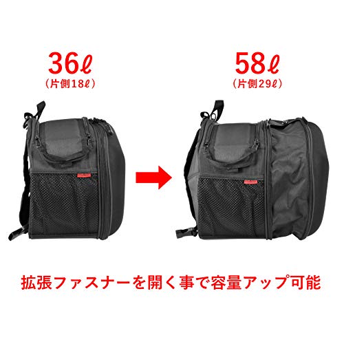 コミネのモールデッドサドルバッグExp(SA-212)は大容量!左右合計で36Lです。ファスナーを開ければ58Lに拡張できます。
