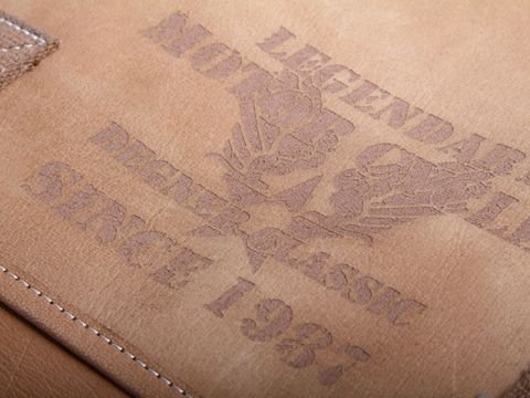 デグナーのミリタリーテイストレザーサドルバッグ(SB-78)は使い込むほどに味わい深くなるサイドバッグです。フラップに刻まれている模様は牛革の経年変化も見越したレーザーエッチング。ガンガン使ってミリタリー感を盛っていきたいですね。アメリカンバイクへの片側取り付けが似合います。
