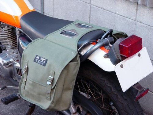 US ARMYサイドバッグは定番中の定番!ベストセラーのバイク用サイドバッグです。アメリカンバイクだけでなく、クラシック系ネイキッドやストリートバイクにも似合います。持ち手がついていますので、バイクの乗り入れができないキャンプ場でも荷物を運びやすいですね。片側取り付けはできません。