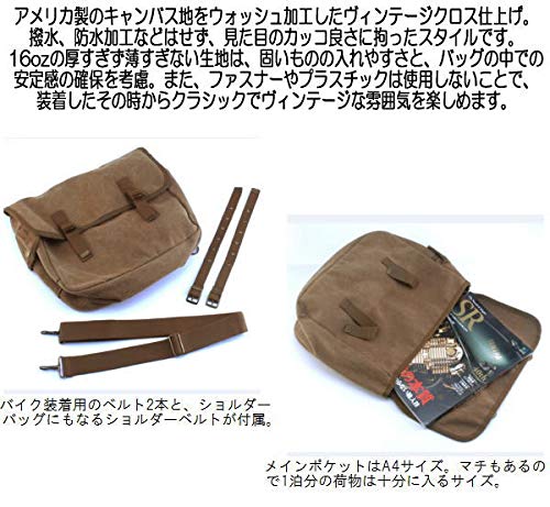 片側取り付けが基本ですが、ダブルで取り付けしてタンデムツーリングもありです。キャンバス生地は合成皮革よりミリタリー感がありますね。残念ながら鍵はありません。