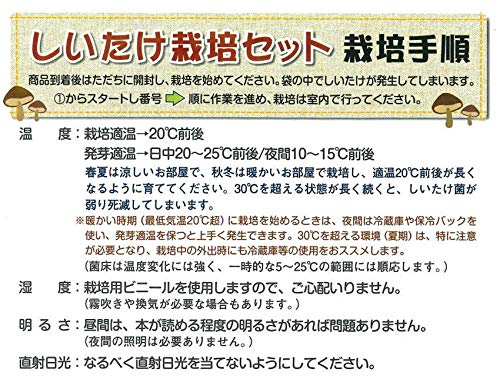 椎茸の栽培に適した温度は8度から25度の間です。低い温度が続くと椎茸菌は活動しにくく、弱ってしまいますので、ビニールなどで保温しましょう。また、エアコンや暖房の風が直接当たる場所は栽培に不向きとなりますので、併せて注意してください。椎茸は本来朝晩の寒暖差に反応して発芽しはじめますので、10度以上の温度差になるように意識してみると本来の栽培環境に近づきます。