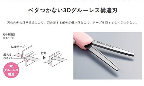 刃の内側は3Dグルーレス構造になっているため、テープなどを切ってもべたつかないという特徴があります。また、刃が2段階のアーチ曲線になっているのでカットしやすく、サッと使えるのでとても便利です。