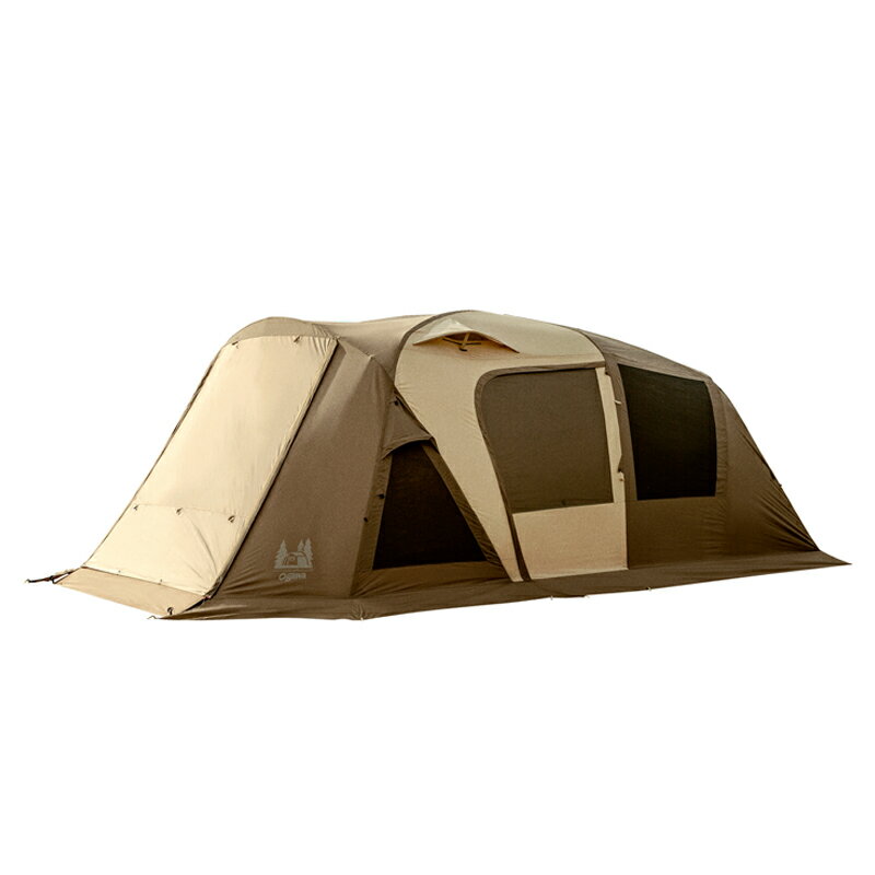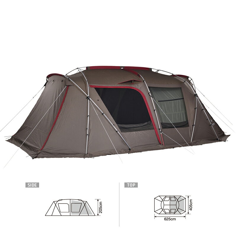 使用人数は5~6人、フレームが太くなっているため34kgと重たいですが、車を含め10㎡の区画に収まるようにデザインされています。人数が多いときは2ルームテントとしては使えなくなりますが別売りのインナーを追加してさらに使用人数を増やせます。さらに採光用の窓があり光も取り込めやすく、冬は窓を閉じておき保温しながら採光可能で使い勝手がいいです。キャノピーも追加されているためいろいろなレイアウトが簡単にできます。