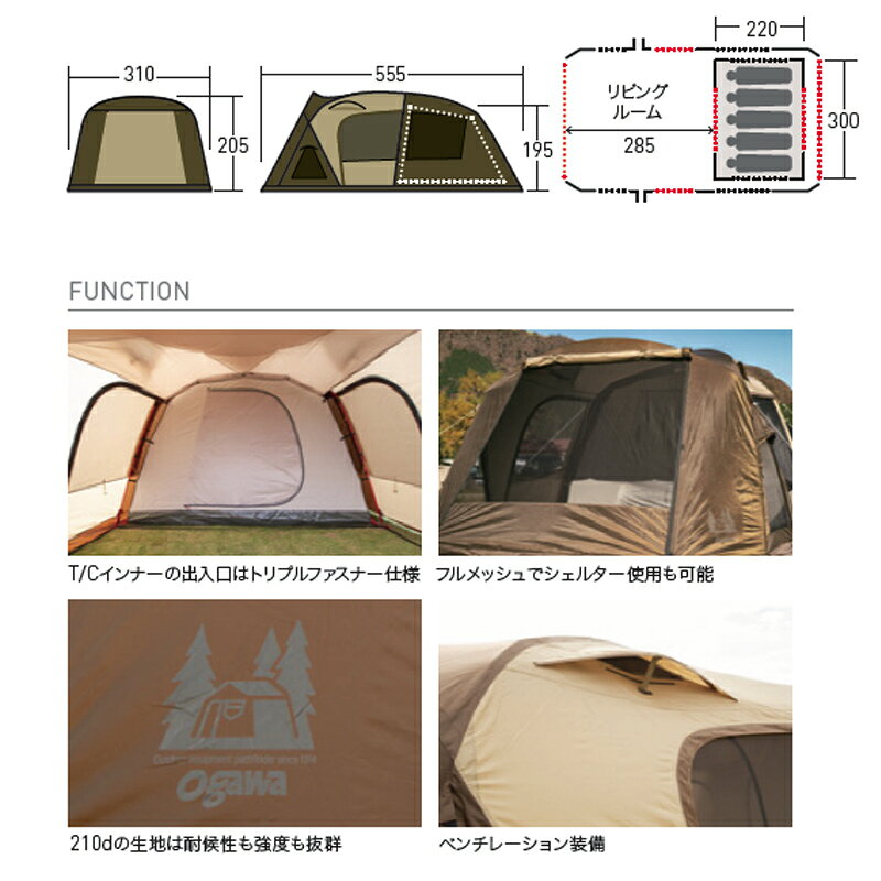 ティエラシリーズは小川テントの定番モデルとなり価格と性能のバランスが取れたモデルです。すべてポリエステルとコットンの混紡だと高くなりますが、インナーだけ混紡になることで価格が抑えられていますよ。インナーのそこはPVCとなり水を絶対にとおさないような素材です。スカート、大型メッシュパネルがありオールシーズン使え、設営も簡単です。フライシートの生地も厚めで高く評価されているファミリーキャンプ向けテントです。