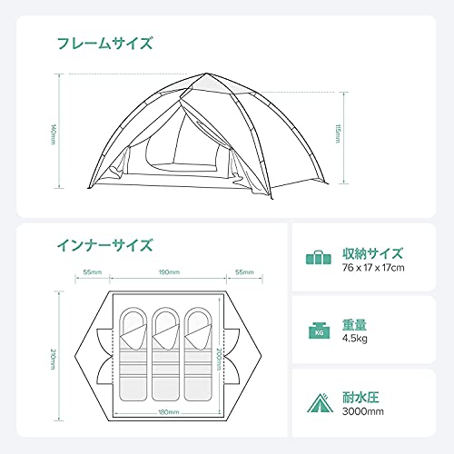 珍しい形状をしていてカラーバリエーションが豊富です。価格が安い魅力的な製品となっていて3箇所の通気口があります。大きいテントですが女性でも簡単に設営でき、収納サイズは25×25×95cm、4.9kgです。1500mmの防水機能、UVカットもあり使いやすいですよ。大人なら3人程度、子どもを含めると5人で使いやすいサイズとなります。
