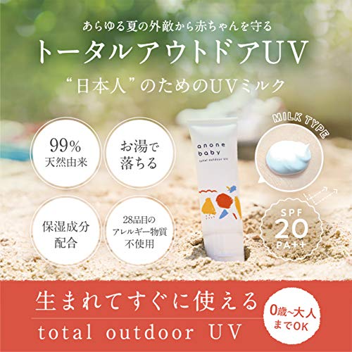 生まれてすぐに使えるトータルアウトドアUVがこちらです。ミルクタイプのクリームで、お湯で落ちるため敏感肌の方も安心して使うことができます。99%天然由来の成分が配合され、植物性のセラミドで潤い肌を実現することができると評判です。SPF20-PA++と日常使いに十分な日焼け止めであり、アウトドアで気になる虫除け対策、pm2.5&黄砂の抗炎症機能が加わり、乾燥や大気の汚れからも肌を守ってくれる優れものです。