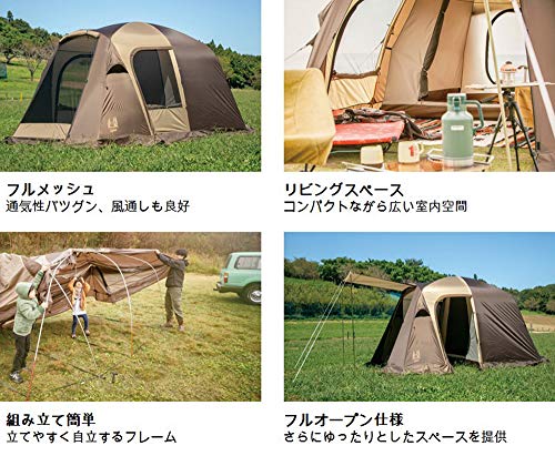 ポール一本を柱として組み立てられるので、初心者でも簡単に手間取ることなく設営することができます。また遮光性・通気性・難燃性の高いポリコットン生地をテントシートに採用していますので、夏場のファミリーキャンプでも涼しく過ごすことができます。急な雨でも安心な撥水加工も施されています。落ち着いた色合いでかっこいいテントなので、レビューでも良い評価を得ています。