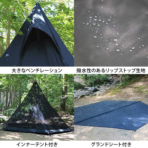 ポール一本だけで簡単に設営できるワンポールテントで、7〜8人でのファミリーキャンプやグループキャンプで活躍する人気テントです。テントの下部分に3つ、トップの三角になっている箇所には4つのベンチレーションもあって、換気をしながら快適に中でくつろぐことができるテントです。レビューでも良い評価をしている方が多数いる人気商品です。