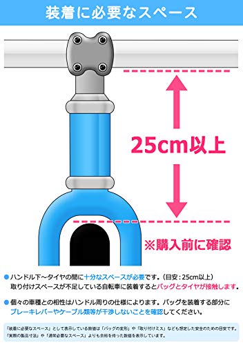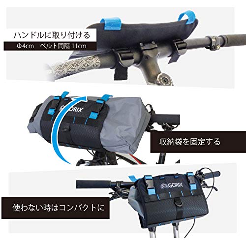 自転車移動中に、中から収納しているものが飛び出さないようにしっかりとバックルで固定できます。自転車のハンドルバーにも簡単に取り付けられます。伸縮式のバッグになりますので、ハンドルサイズに合った収納ができて便利です。また使わないときはコンパクトになるバッグで、専用の収納袋の中に入れておくことができます。正面にはゴリックスのおしゃれなロゴや英文字が付いています。