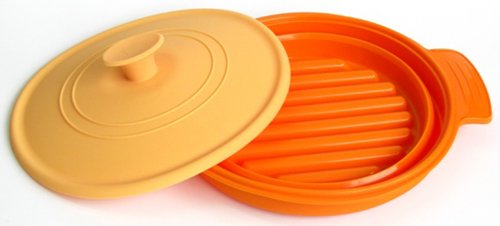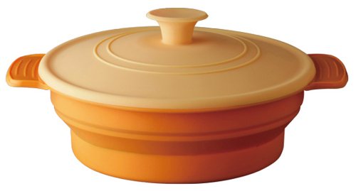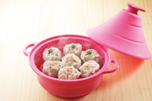 タジン風の万能シリコンスチーマー、シリコンマルチスチーマーレンジで三役です。こちらのシリコンスチーマーは樹脂製なので、作りがしっかりとしていてぐにゃぐにゃしないのが特徴です。また、スチーマーの背の高い蓋の部分は折りたたみ可能と口コミでも評判です。