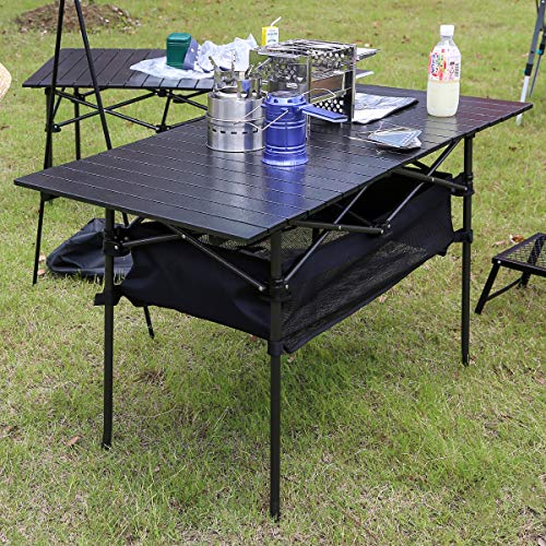 YOLER キャンプテーブル 折りたたみ メッシュラック付き 120x55x68cm アルミ ロールテーブル アウトドア (ブラック)