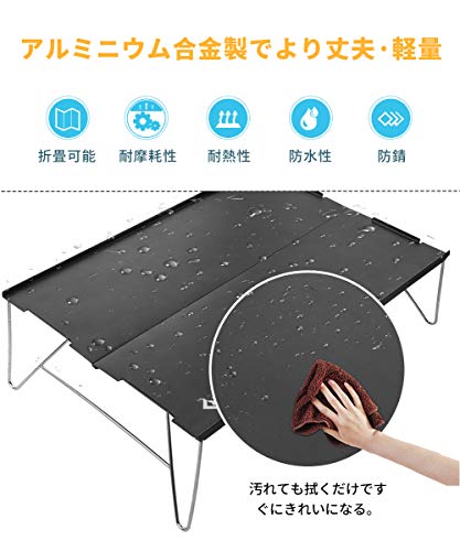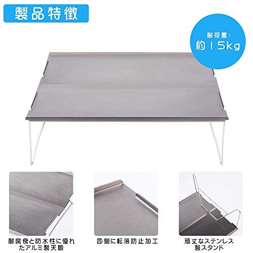 組み立て・撤収にも時間がかからないため、誰にでも活用しやすいです。天板は耐腐食性や防水性に優れているアルミ製で、天板の裏には転落防止用の加工も施されています。頑丈でサビに強いステンレス製のスタンドを採用しているため、しっかりとアルミ天板が支えられて、耐荷重も15kgまで問題ない仕様となっています。価格も非常に安いのでコスパも良いです。お一人でのソロキャンプでも使いやすく、バーベキューやピクニックでもちょっとした備品を置くのに役立てられる机です。
