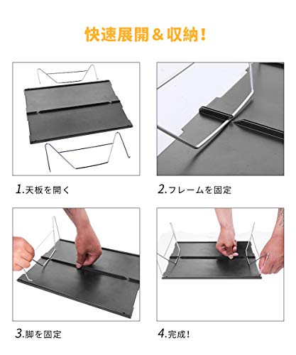 中央部から2つに折りたたみすることができ、上部には便利なハンドルも付いているので、ビジネスバッグのように片手でも楽に持ち運びできる机です。ロースタイルのキャンプをはじめ、レジャーシートを広げてのピクニックやバーベキューなどでも役立つアルミ製の机です。天板の角部分にはブランドのロゴマークも付いていてお洒落です。組み立ても工具を使用せずとも、広げるだけのシンプル構造なので、力の弱い女性でも簡単に素早く設置できます。また値段も安い机なのでコスパも抜群です。
