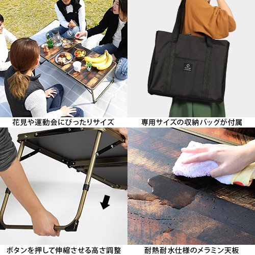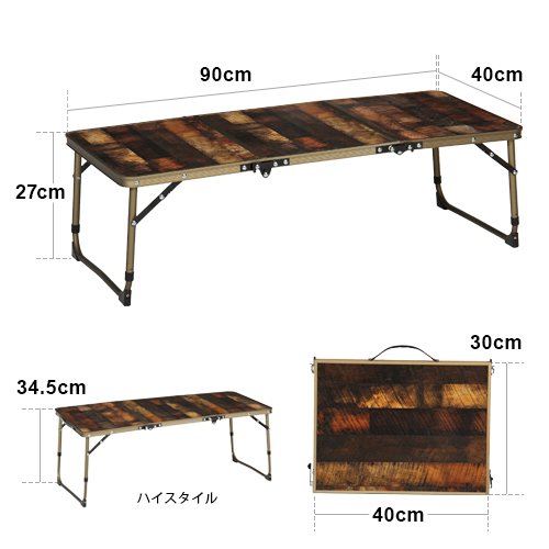 天板は少し古ぼけたようなヴィンテージ風のデザインとなっておりとてもお洒落です。3つに折りたたみできますので、より小さくコンパクトに持ち運びすることが出来ます。高さはありませんが、横幅があるロースタイルテーブルになりますので、3〜4人でバーベキューをする時などにも、コップやお皿などをたくさん置いて使うことが出来ます。またそのままでも高さの低い机にはなりますが、さらに低い高さに調整して使用することも可能です。木製のようなおしゃれなヴィンテージ天板には、メラミン加工が施されているので、熱・汚れにも強いです。