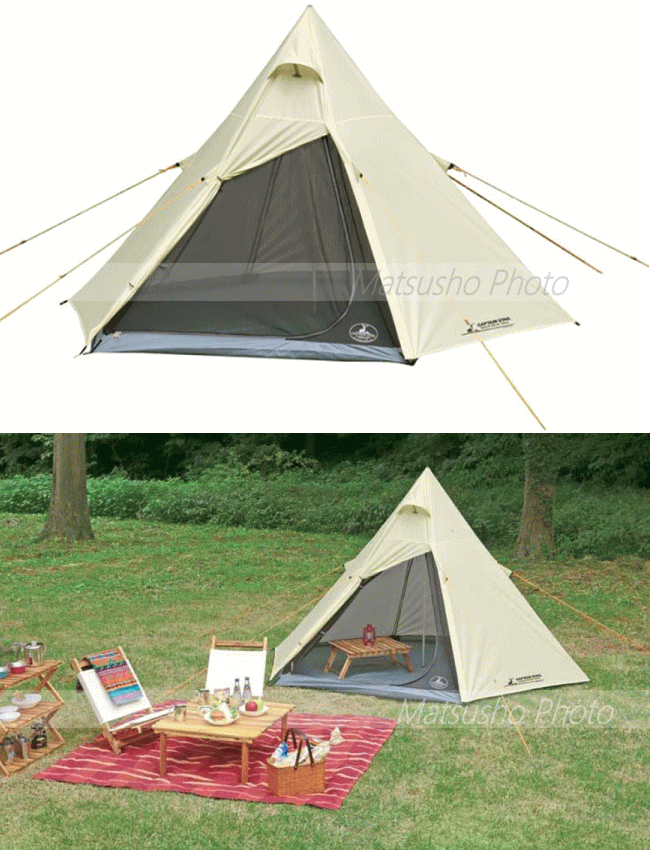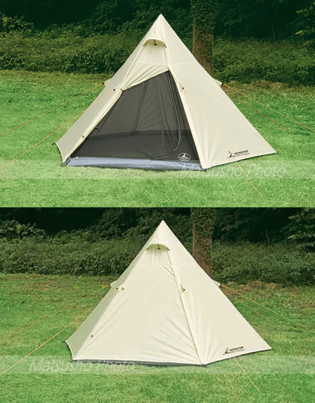こちらのテントは、シェルターとしても フライシートのみで使用することも可能です。ワンポールテントは設営が簡単で、ペグを打ち、ポールを立ち上げることで設営できます。