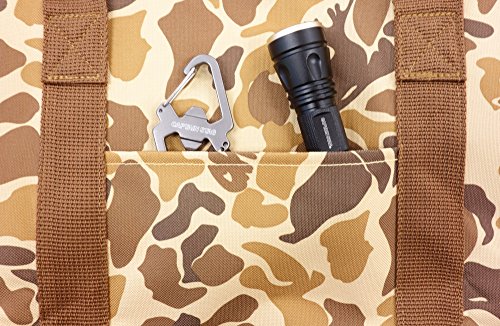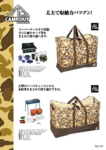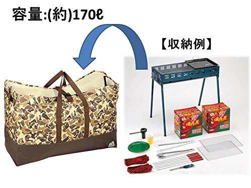 キャプテンスタッグの迷彩柄大型トートバッグです。迷彩カラーはおしゃれでとてもかっこいいのでキャンプ場でも目立つ事間違いなしですね。容量も170Ⅼとかなり大きくキャンプ用の焚き火台や炭なども簡単に入ります。ファミリーでのオートキャンパーに人気のトートバッグですよ。入り口の真ん中には調整可能なバックルバンドが付いていますので、バッグの中身のバラつきも抑えてくれます。外側には収納ポケットが付いていています。ポケットにはライトやロープなど細かい装備を入れる事ができますよ。テントやシュラフなども入れて一度に運びたいですね。