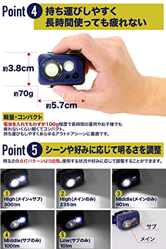 いろいろなライトがあるため迷いやすいです。まずは明るさに注目してください。150lm(ルーメン)や80lmと表記されている場合150mlのほうが明るくなります。明るいと使用時間が短くなるため300ルーメン以下程度がおすすめです。明るくて長時間使えるものもはリチウムイオン電池が使われていて電池よりも少し扱いが複雑になります。バンドの長さがきちんと調整できワイドに照らせると視界が確保しやすいですよ。