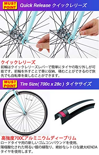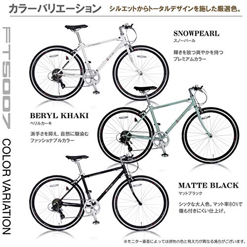 世界的にも評価の高いメーカーであるシマノのサムシフターを採用していて、素早くギアチェンジすることができます。また前輪はクイックリリース仕様になりますので、旅先に輪行することも簡単な自転車です。ダブルピボットキャリパーブレーキ採用で制動力も高い自転車なので、フラットバーロード初心者の方にも安心安全に乗ることができます。表面はクリアコーティング仕上げしているので、光沢感があって美しい自転車です。