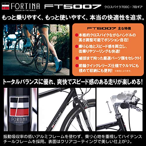 軽量で耐久性にも優れているアルミニウム合金を素材としてフレームに使っている自転車で、フラットバーが標準装備されていますので、アップライトなポジションですサイクリングを楽しむことができます。またフレームはスムースウェルディング加工で仕上げられているためにとても美しいです。細身の700×25Cのタイヤを装備していますので、スピード感あふれるサイクリングを楽しめる。またシマノSORAを採用した18段変速器を搭載していて、コンパクトクランクを採用している特徴もありますので、スムーズなギアチェンジができ、初心者にも乗りやすい自転車です。
