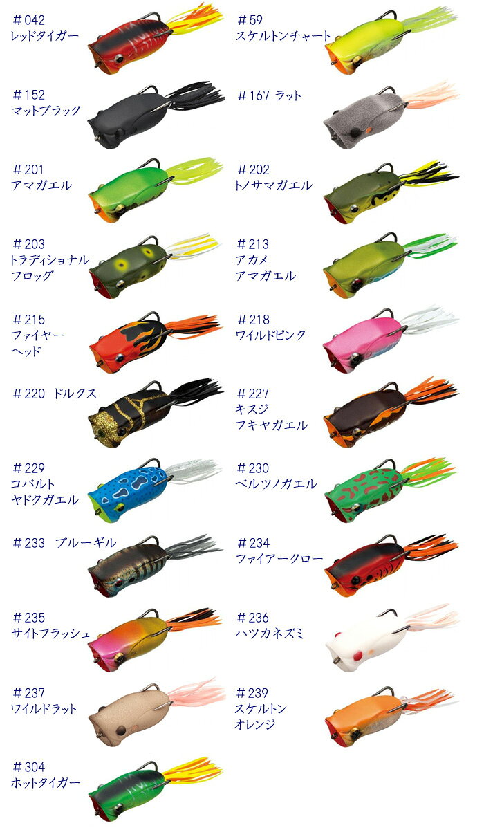 Ever Green(エバーグリーン)のPOPPER FROG(ポッパーフロッグ)。前川はオーバーハングやヒシモの多いエリアでもあるため、ぜひ使いたいルアーの1つです。ポッパータイプになっているため、水を押す力も強く少し離れた場所にいるバスにもアピールすることができ、やる気のあるバスのバイトを誘うことができます。移動距離を抑えることで、より多くのバイトを誘いましょう。