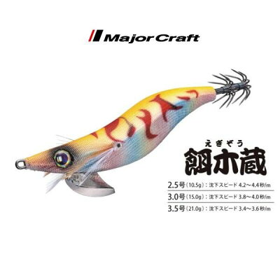 おすすめのエギ1本目は、メジャークラフトから餌木蔵です。特徴はシャープノーズにより、シャクリが鋭く決まる点。フォールは前傾姿勢で沈むので、誰でも切れの良く浮遊感のあるダートアクションが発揮できます。さらに透過に差があるカラーを的確に使い分けることで、視覚的にイカへのアピールが可能です。