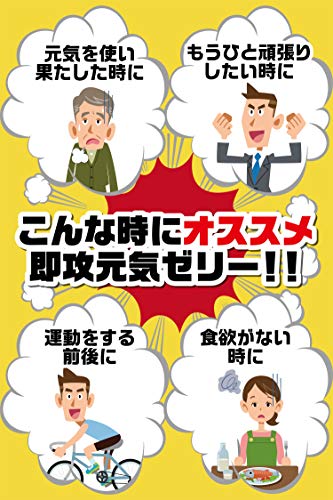 ゼリー「飲料」ですので、固形タイプではできない水分補給も兼ねて使えます。その分高カロリーではないので注意してくださいね。コスパや安さを気にしないのであれば、高カロリーで高機能なスポーツ向けのゼリーやジュレもあります。速攻元気は手軽に買えて、そこそこカロリーがあり、アミノ酸などが含まれている点が優秀です。少なめのカロリーは他のお菓子で補うなど工夫すると大丈夫ですよ。