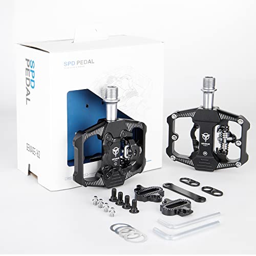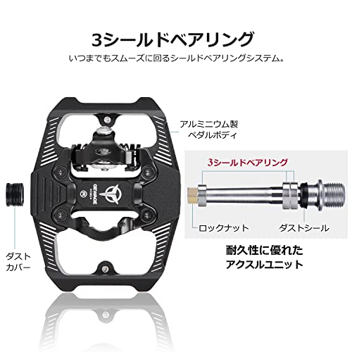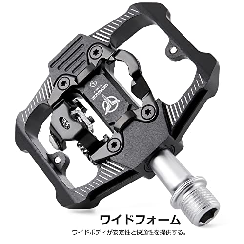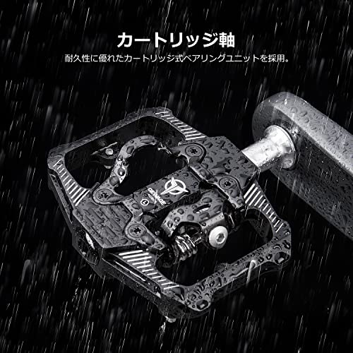 片面側がビンディングシューズを固定できるSPDクリップインデザインなので、クリートを使ってガッチリと足がペダルから離れないように固定することができ、スムーズなペダル操作が可能となります。
