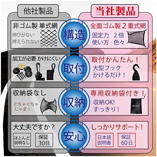 フリードスパイクのユーティリティフックと2列目シートのアシストハンドルを利用してネットを設置しましょう。置き場に困る小さな荷物を収納すると車内を整理できます。朝食用に買ったパンやおにぎりを載せておけば寝ているうちに潰してしまうこともありません。前席の背もたれを倒して就寝場所を確保するシートアレンジではクッションを収納できます。荷室フロアのタイダウンフックを活用すれば荷崩れ防止に使えますので、アウトドアレジャーでも便利に使えるグッズです。