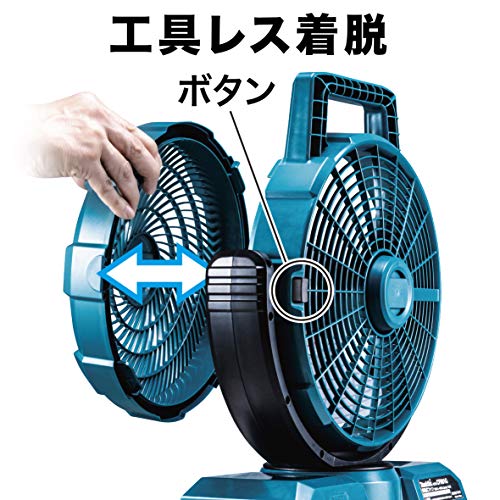 マキタの扇風機でも一番小さなタイプで、風量は「強」で毎分180m、「中」で毎分150m、「弱」で毎分120mです。「強」は、家庭用扇風機の「中」程度の風量で、ジョギングの際に感じる風と同等になります。