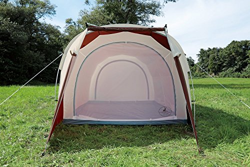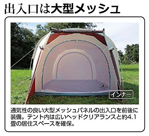 室内が非常に高く2mあり、日本の大型テントにはなかなかない開放感のあるテントです。コットンの特性に加え、前後それぞれ2つの大型メッシュパネル(出入り口)とサイドの窓により換気がしやすく、キャノピーとして跳ね上げると小型のリビング部分も確保でき過ごしやすいですよ。おしゃれで飾り付けなど室内のレイアウト、サイトレイアウトも楽しめます。6人用の大型テントで100%コットン製にしては安いコスパのいいテントです。