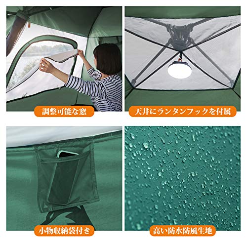 出典: https://www.amazon.co.jp/Hewflit-%E3%83%84%E3%83%BC%E3%83%AB%E3%83%BC%E3%83%A0%E3%83%86%E3%83%B3%E3%83%88-300cmx400cmx215cm-%E8%80%90%E6%B0%B4%E5%9C%A73000mm-%E5%8F%8E%E7%B4%8D%E8%A2%8B%E4%BB%98%E3%81%8D%EF%BC%88%E3%82%B0%E3%83%AA%E3%83%BC%E3%83%B3%EF%BC%89/dp/B07528256F/ref=sr_1_2?__mk_ja_JP=%E3%82%AB%E3%82%BF%E3%82%AB%E3%83%8A&dchild=1&keywords=Hewflit+%E3%83%84%E3%83%BC%E3%83%AB%E3%83%BC%E3%83%A0%E3%83%86%E3%83%B3%E3%83%88&qid=1598721771&s=sports&sr=1-2耐水圧が3000mmとしっかり表記されていて、インナーとフライシートに分かれているダブルウォールテントのため日本で使いやすいタイプのテントです。前述した寝室とリビングの2ルームにしたり、ワンルームにしたりと人数によって使い方を変えられさまざまな人数でキャンプができます。UVカットやシルバーコーティングが施されていて機能的で日本語の説明書付きです。収納サイズは70×30cmと比較的コンパクトなります。