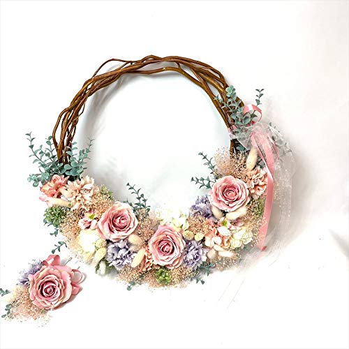 結婚式にふさわしいホワイト系のシルクフラワーと、ふわふわした羽根のようなフェザーグラス、パールピックを使った清楚な印象のリースブーケの作り方です。シルクフラワーは茎を短くカットし、リース台へボンドで接着します。大きい花を咲きに配置し、すき間を埋めるように小さい花を並べましょう。