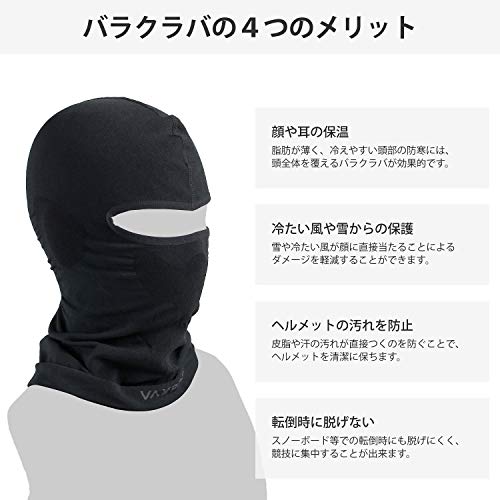 バラクラバとは目出し帽のことで、顔の目元を除く全体を覆い隠すことができる被り物です。基本的には目元だけ開いている商品が多いですが、中には口元も開いているバラクラバもあります。防風&防寒性の高いバラクラバを身につけるだけで、顔・頭・首元を冷えないようにガードすることができます。