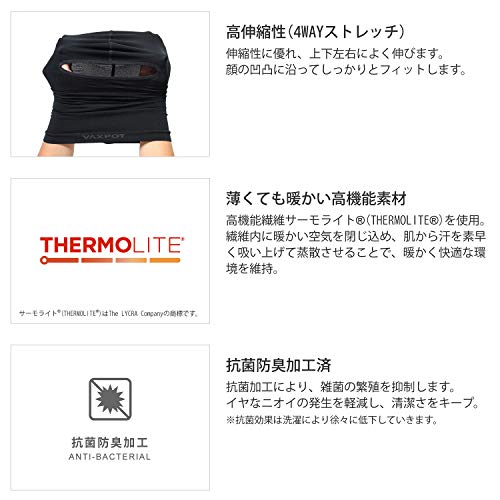 高機能な繊維サーモライトを使って作られているので、冷たい風が吹き荒れるゲレンデでも顔や頭周りをしっかりと保温してくれるバラクラバです。伸縮性にも優れていてフィット感が良いバラクラバです。無縫製なので違和感も少なく身につけられます。