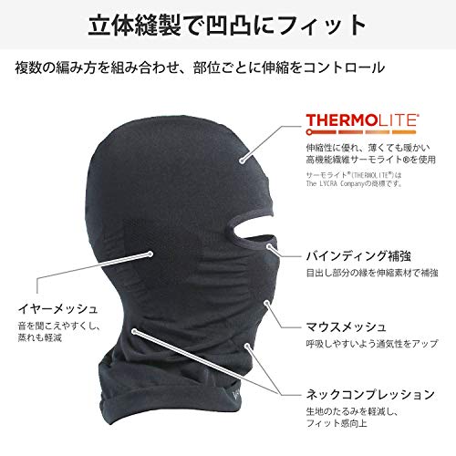ニット編みの一体成型で仕上げている薄手バラクラバで、部位によって異なる編みパターンを採用している事でフィット感を高めています。更に汗処理機能を高めるポリプロピレンを肌面に用いている生地を採用しているので、汗ムレも少なくベタつき感少ないドライな状態をキープしながら被れます。