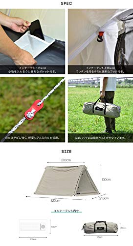 | 素材 | フライ/コットン混紡生地(ポリエステル65%・綿35%)・インナー/ポリエステルメッシュ・フロア/ポリエステル・フレーム/アルミ合金 |
