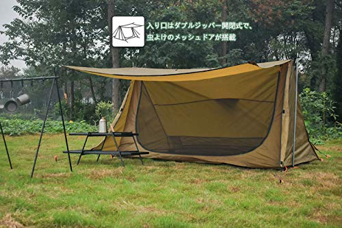 通気性良いメッシュインナーシートも採用されている一人用のパップテントで、メッシュインナーシートは取り外しすることもでき、サイドはジッパーで開閉できるのでタープのような形にしても便利に使えます。