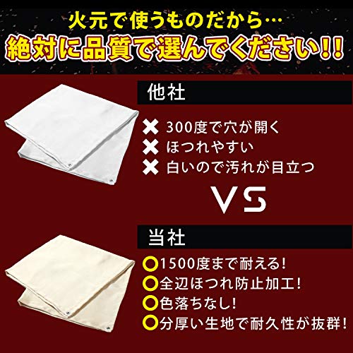 火花を弾くシリカ繊維(ガラス繊維の一種)と吸着する耐炎繊維(アクリル繊維)があります。本来の使い方となる溶接時の地面保護に使う場合は素材を吟味する必要がありますが、焚き火を楽しむときに地面保護するだけの使い方ならどちらでも大丈夫です。