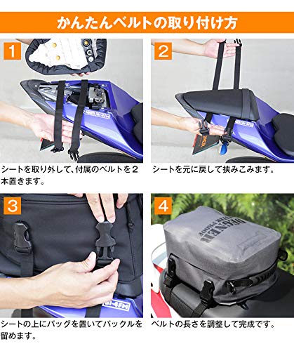 デグナーの防水シートバッグにレインウエア、防寒着、お菓子や飲み物を入れてツーリングへ行きましょう。8.6Lの容量はすぐに取り出して使いたいものを入れるのにちょうどいいサイズです。すぐに取り出して取り出したいアイテムの多くは濡れては困るものばかりです。キャンプツーリングや宿泊ツーリングではメインのシートバッグに乗せて使えますタンデムシートにベルトを通して固定し、バイクを離れるときはバックルで手軽に外せます。