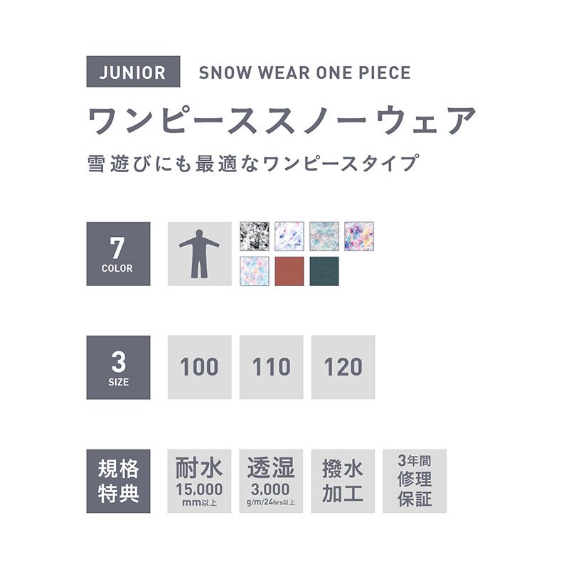 キッズ、ジュニア向けの上下が一体型になっているつなぎタイプのウェアです。ガールズ、ボーイズに分かれていない分7パターンのウェアが選べますよ。透湿性、耐水性があり雪遊びのときの服装としてもおすすめです。雪が入らない構造のため安心して雪遊びができます。袖丈などを長くする調整機能もありますよ。