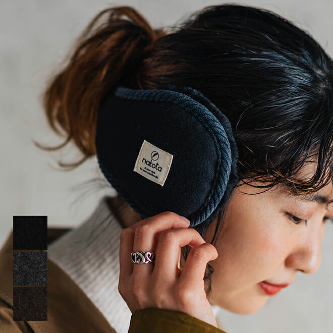 nakotaというブランドメーカーより販売されているコンパクトイヤーマフは裏ボア仕様で、寒さが極まる秋や冬の季節のお出かけシーンでも活躍します。表側にはブランド名が表記されているタグが付いています。